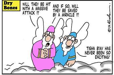 This is what we would call Dark Humour. The cartoon refers to, of course, the imminent attack on Israel by Iran, supposedly in retaliation for the assassination of Hamas’ top leader while he was visiting Iran. Israelis have been told to stock up on food and water in fortified safe rooms, hospitals prepare to move patients to underground wards, search-and-rescue teams are positioned in major cities. Neighbours are comparing checklists of what they’ve stored (“don’t forget the can opener!”) and the IDF has forbidden all soldiers to leave the country. Israel is preparing itself for a Tisha B’Av that, in the words of Yaakov Kirschen, “has never been so exciting.”